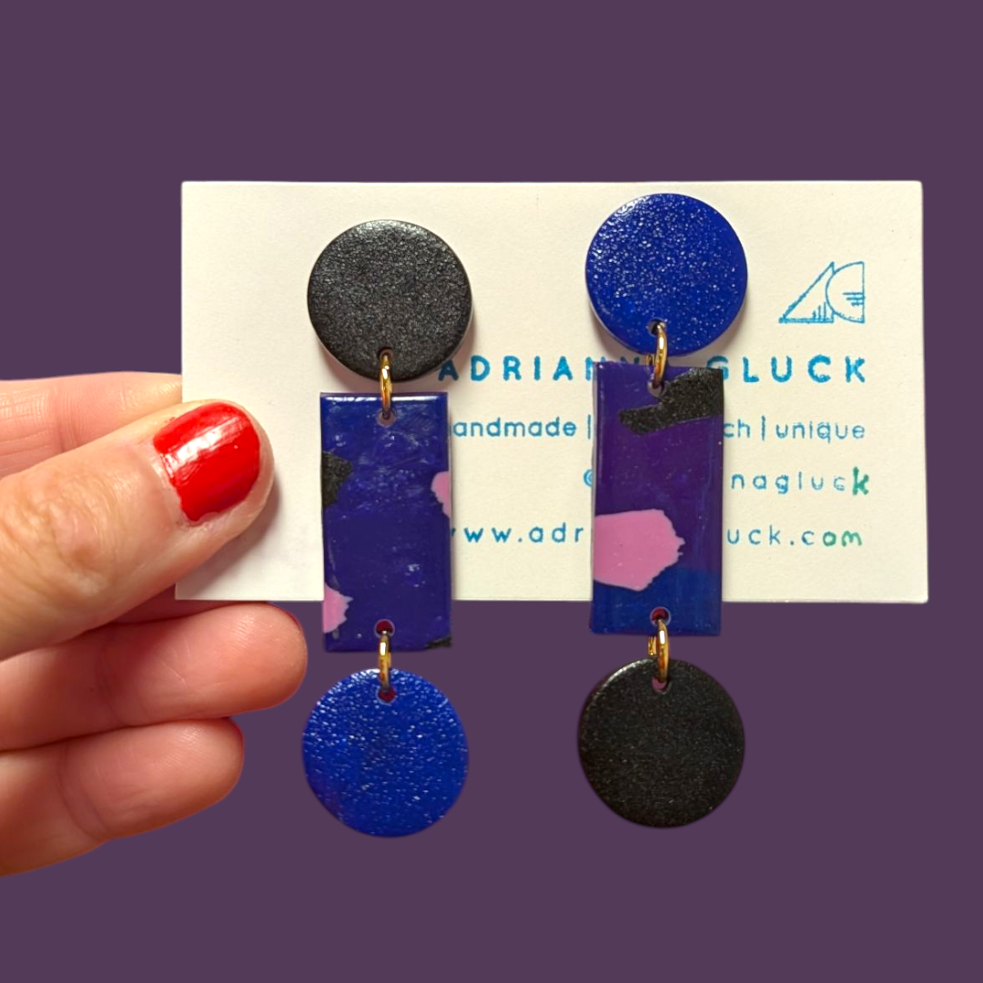 Made with handmade, hand-blended, and hand-textured light and dark purple, black, and navy blue polymer clay, gloss varnish, and nickel-free posts.